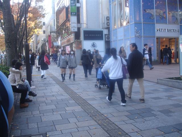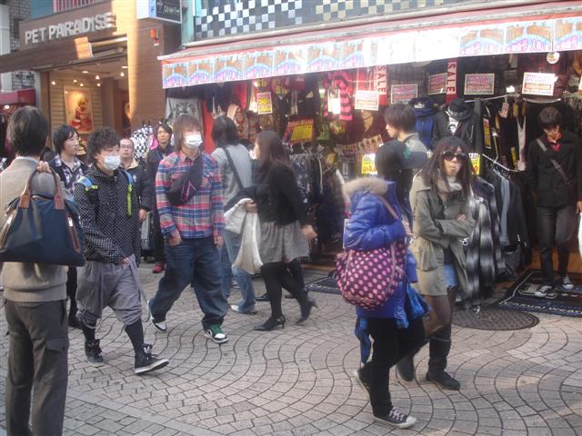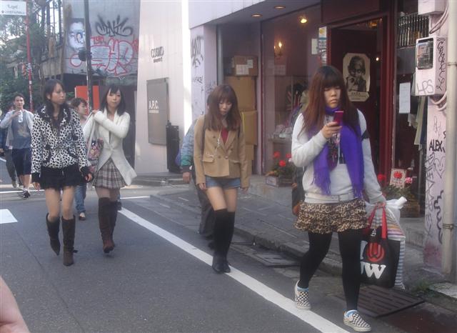 Guys made their own fashion statement. Guys' fashion can be quite bright and colorful. In the first picture, note the phone danglies coming out of his pocket. Men from teens to 30 years of age sometimes wore brightly colored shoes (red, yellow, and green tennis shoes, for example) as well as brightly colored jackets or pants. It wasn't common but it was more frequent than in the US.