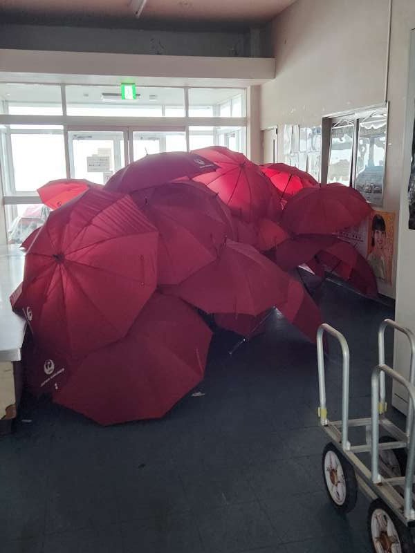 The airport offers umbrellas to flyers so they can get from the airport to the plane dry while it's raining. On the day of my departure, I arrived before most of the staff and found Umbrella Hill (the umbrellas were left overnight to dry).